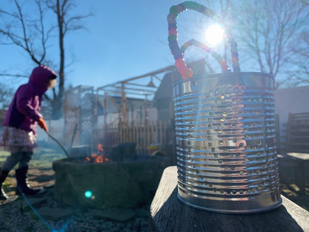 Our moon craft was fun! We made full moon lanterns together after reading our sweet monthly full moon story. Side note: What I love about the stories is that they link together each month to form a journey throughout the year! Each story also introduces a new supporting character within its chapter, and the supporting characters bring new life lessons and morals into our lives, such as completing an “act of kindness” in order to help the full moon rise. Cutting out a beautiful illustration of the supporting character and gluing it onto our story board is also greatly anticipated by my kiddos. Back to our full moon lanterns – we took tin cans, nailed holes into them, beaded a wire handle and placed a tea light inside. They are gorgeous and we’re still enjoying their simple beauty; especially as the light shines through the holes and illuminates our sweet little moon lanterns!