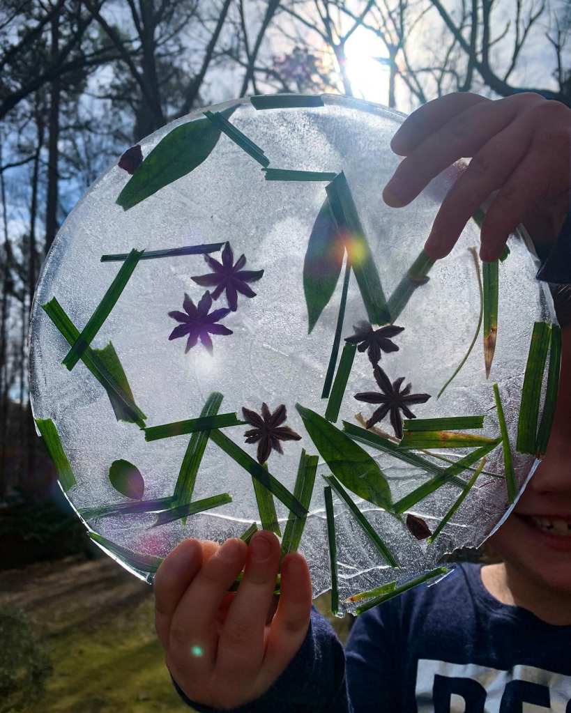 Begin with a nature walk to collect your nature treasures. Add your treasures into your shallow tray, pour water over it, and let it freeze (you can put it outside or in your freezer to achieve this). Once frozen, gently detach the ice from your tray, drill a hole in the top, tie twine or ribbon through it and hang from a tree – or wherever you’d like to.
